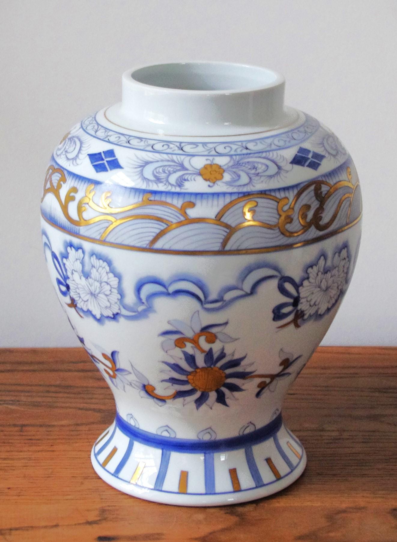 Featuring a striking blue and white geometric patchwork, meticulously hand-finished, with parcel gilt highlights accentuating the rim and the elegantly scrolled handle. The surface is alive with a tapestry of Japanese-inspired motifs, including the manji symbol, signifying prosperity and well-being—arranged in dynamic, asymmetrical panels that evoke the sophisticated simplicity of Japanese design.