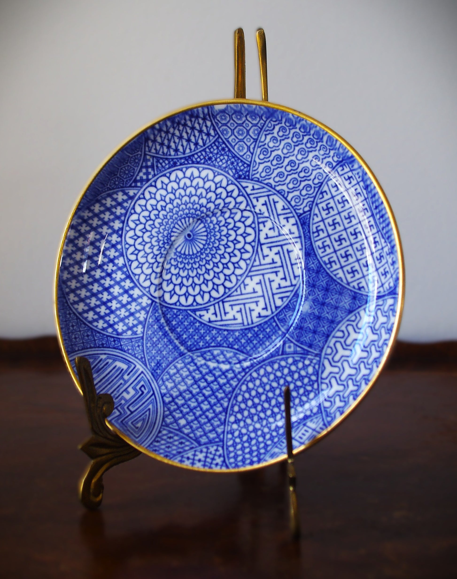 Featuring a striking blue and white geometric patchwork, meticulously hand-finished, with parcel gilt highlights accentuating the rim and the elegantly scrolled handle. The surface is alive with a tapestry of Japanese-inspired motifs, including the manji symbol, signifying prosperity and well-being—arranged in dynamic, asymmetrical panels that evoke the sophisticated simplicity of Japanese design.